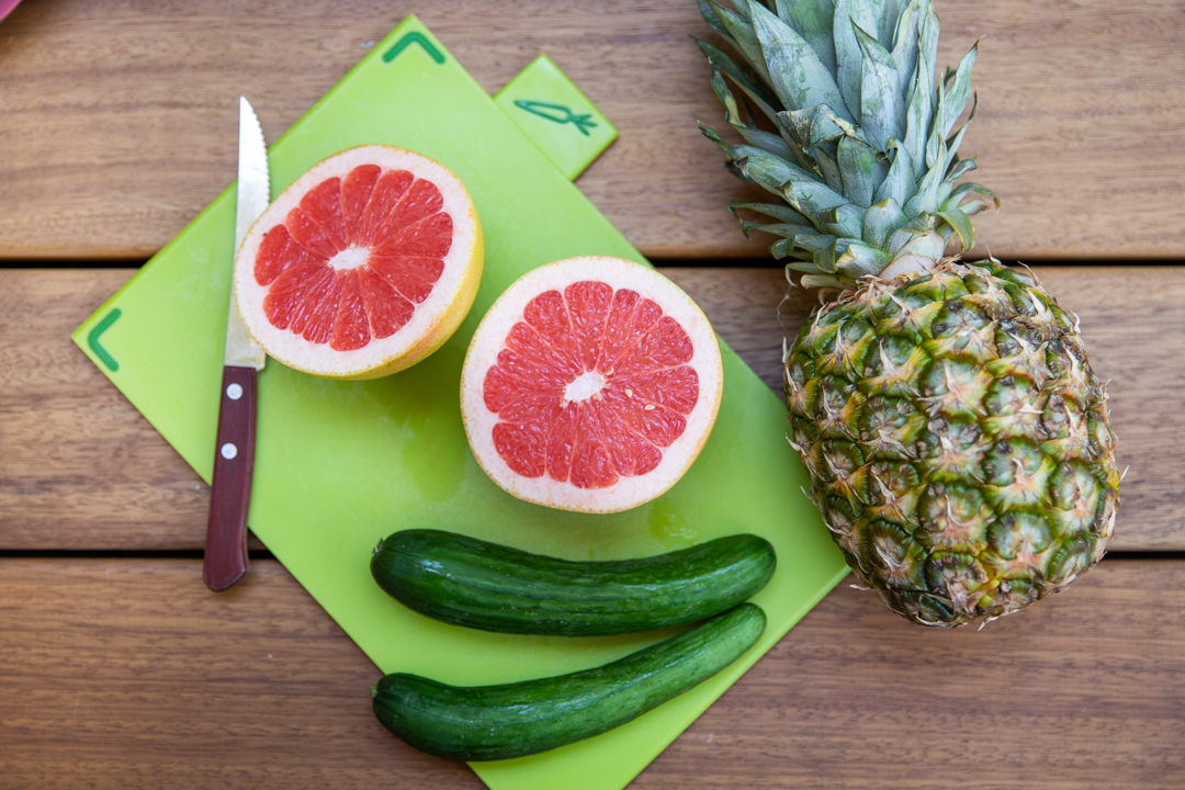 Κόψτε τα αγγουράκια και τον ανανά σε μικρά κομμάτια και στίψτε στον αποχυμωτή το γκρέιπφρουτ. Σε περίπου 30 δευτερόλεπτα θα έχετε έναν πραγματικά αποτοξινωτικό χυμό που θα σας ανανεώσει στο λεπτό. Καταναλώστε τον αμέσως και αν θέλετε, προσθέστε θριμματισμένο πάγο στα ποτήρια!